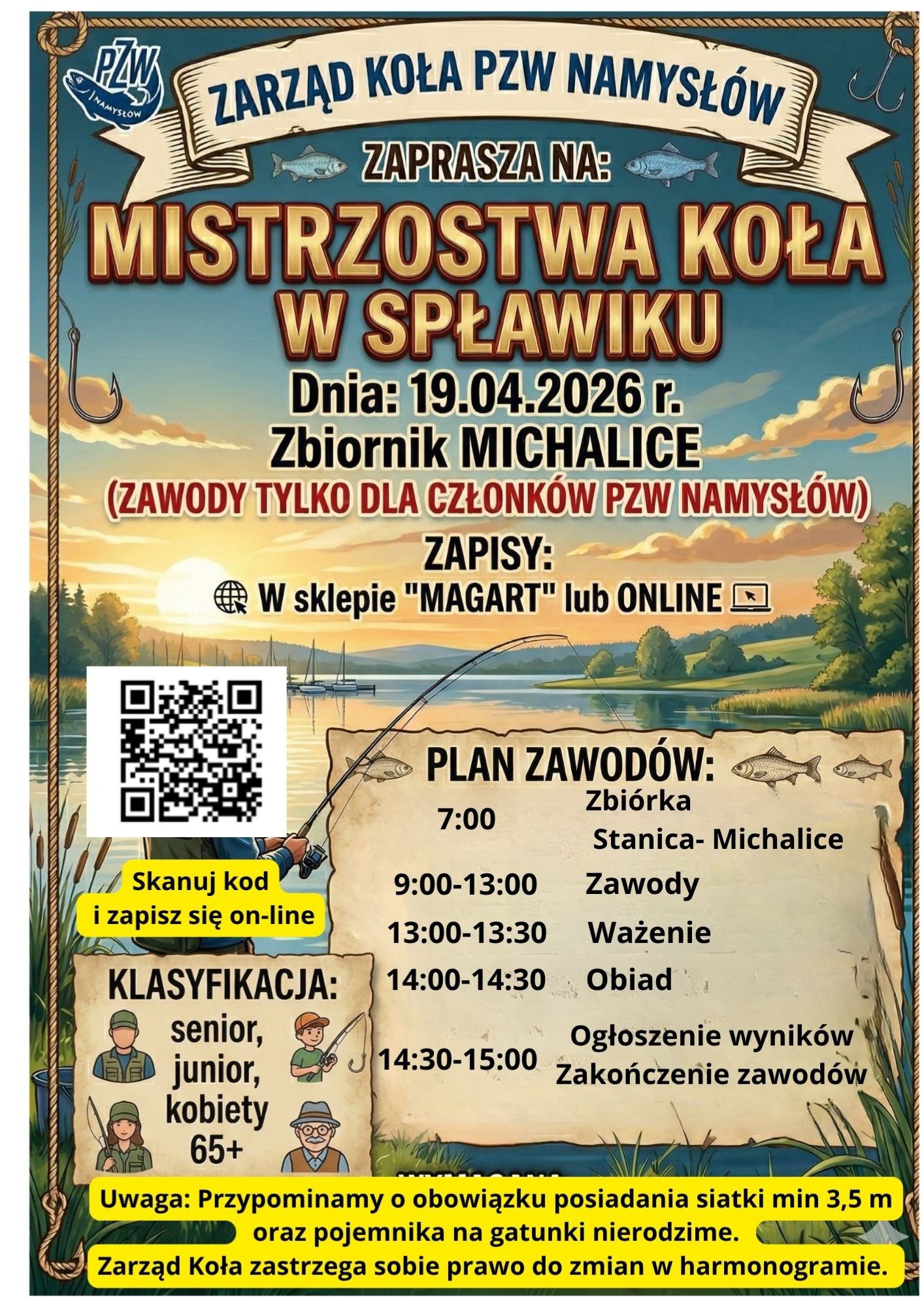 Zawody Spławikowe o Mistrzostwo Koła PZW Żółkiewka dnia 26 kwietnia 2026 r.